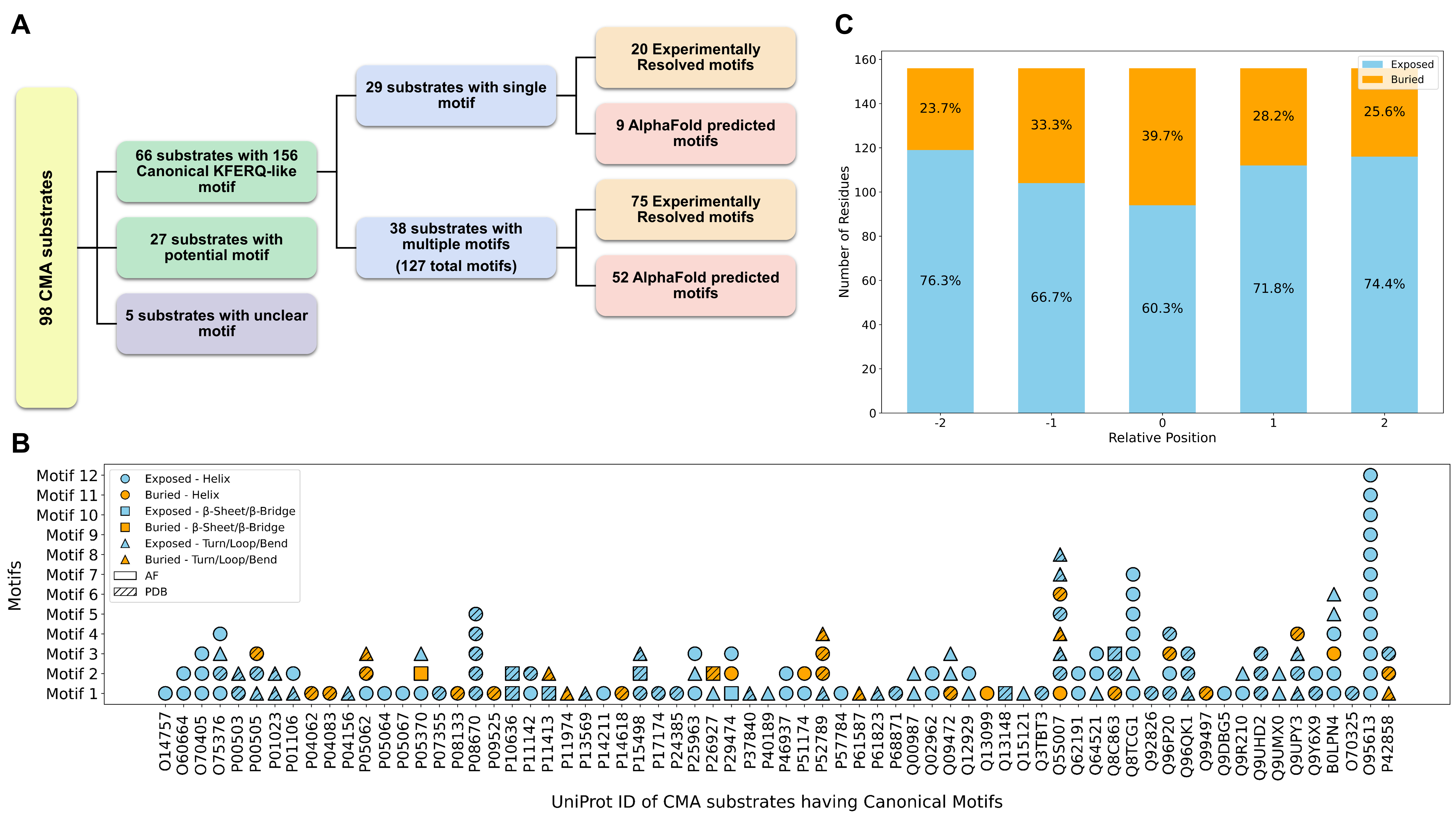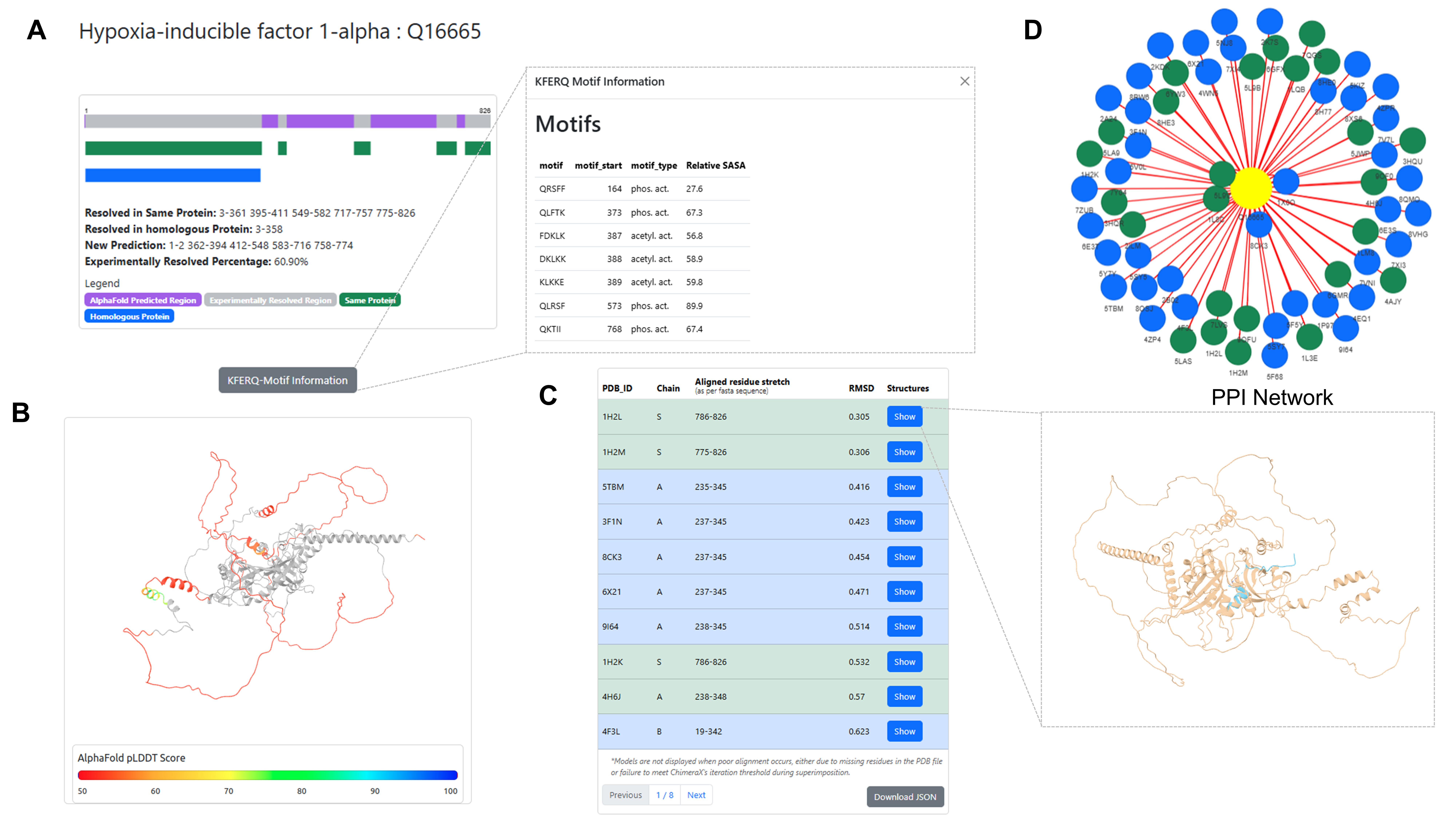 To support broader exploration, we developed an interactive web server that enables users to query proteins, retrieve all available PDB entries, identify homologous structures, perform structural superimposition with RMSD calculation, and highlight unresolved regions. For CMA substrates specifically, the server displays canonical and potential motif positions, and their solvent accessibility—providing a valuable platform for motif prediction and insights into CMA-mediated degradation.